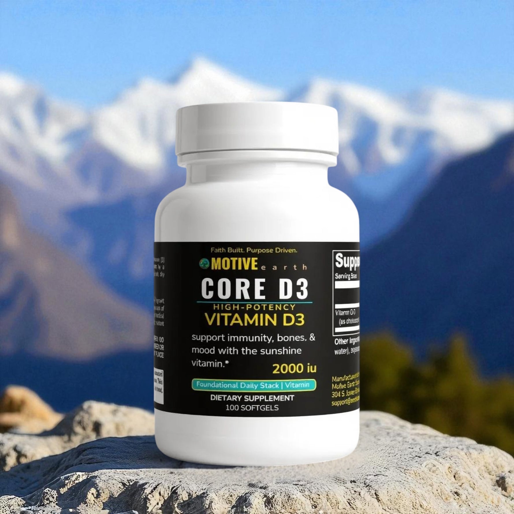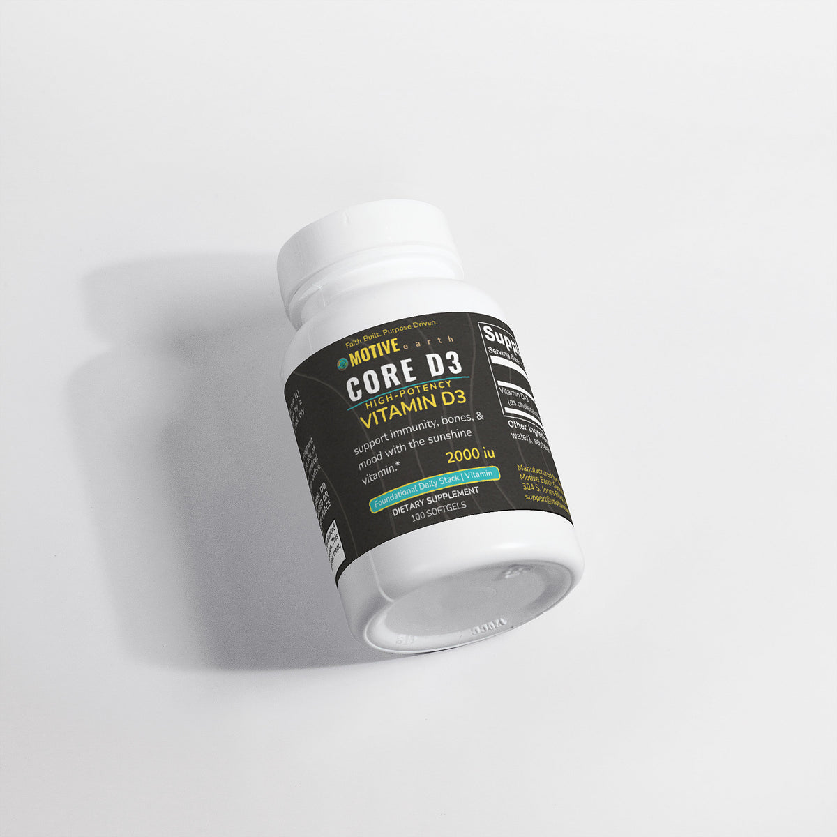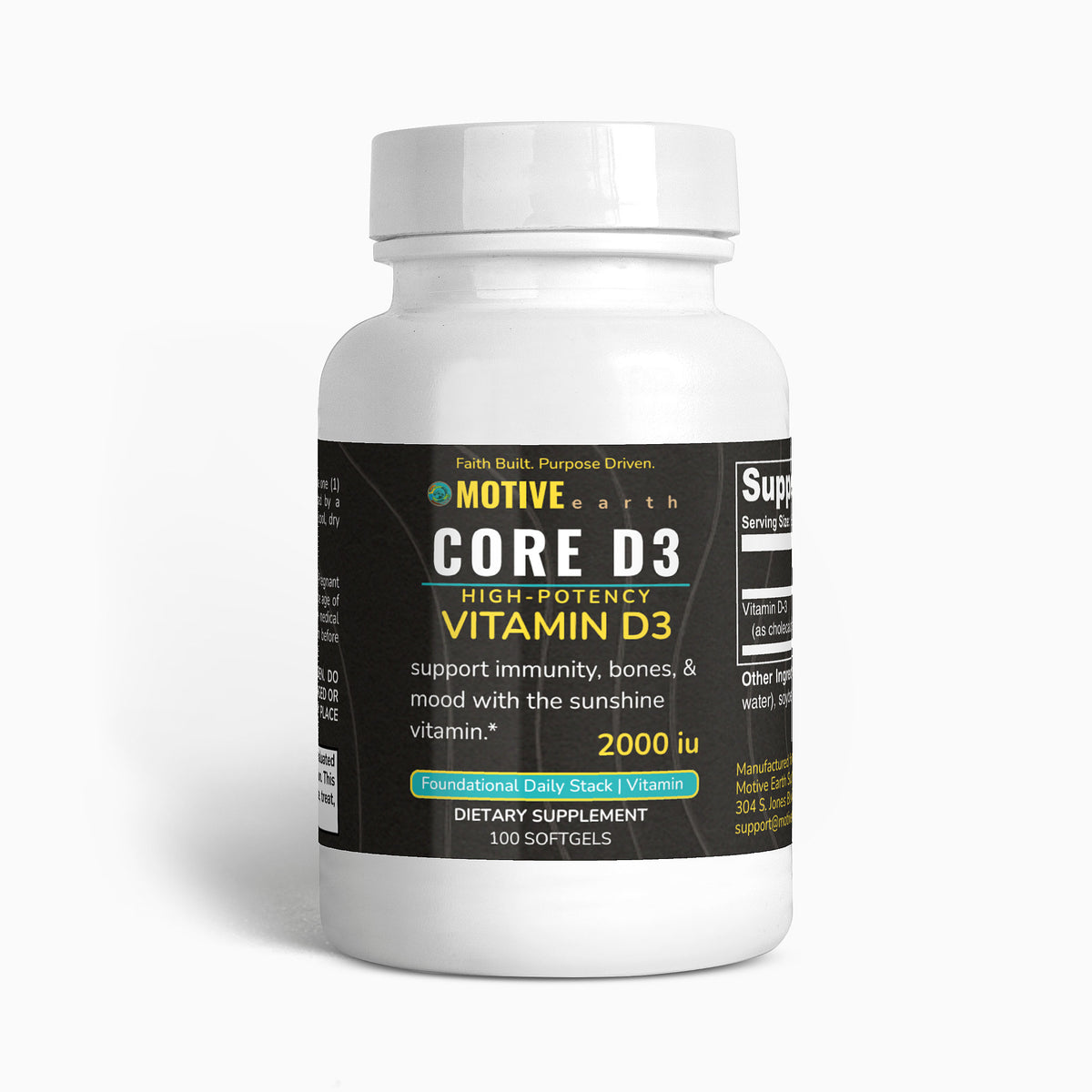 Core D3 by Motive Earth delivers essential 2,000 IU's of Vitamin D3 (cholecalciferol) in a bioavailable softgel form to help support bone density, immune function, and emotional wellness.